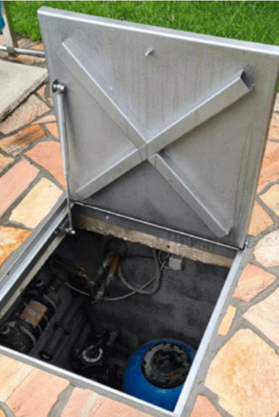 Rozsdamentes burkolható aknatető saválló gázrugókkal. 25 mm mély tálcával, ami műgyantás alapozóval és homokszórással van ellátva a jó tapadás miatt.