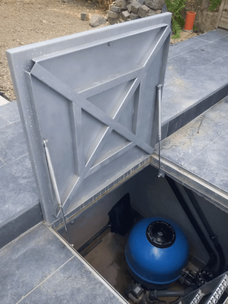 Rozsdamentes burkolható aknatető saválló gázrugókkal. 65 mm mély tálcával, ami műgyantás alapozóval és homokszórással van ellátva a jó tapadás miatt.
