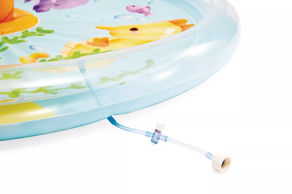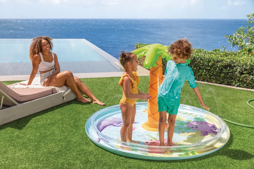 Felfújható medence középen pálmafával és a kerületén lévő lyukaknak köszönhetően a kerti slaghoz csatlakoztatva egy kellemes szökőkúttá alakítható.