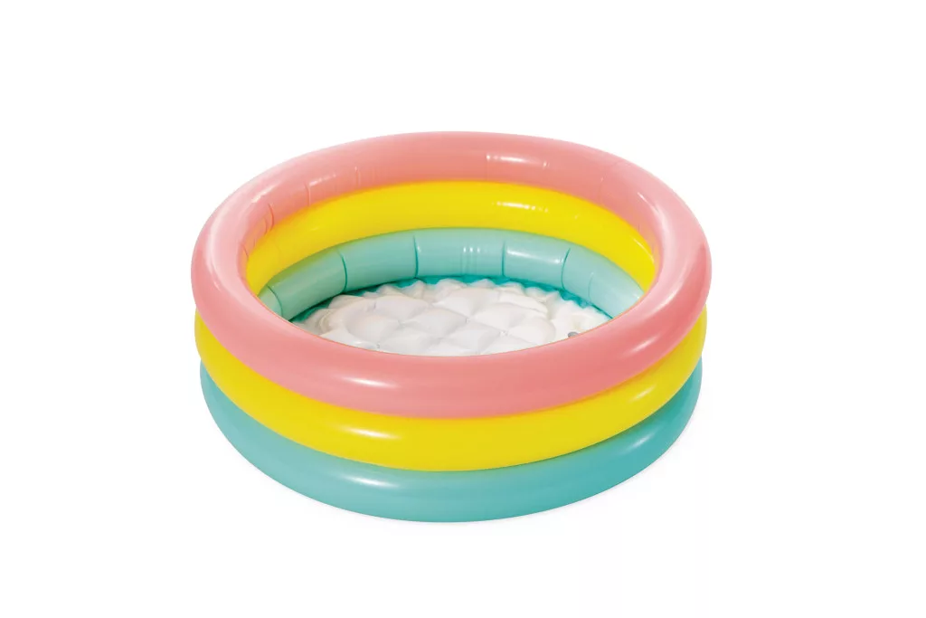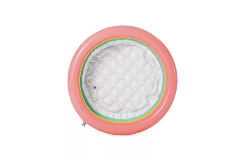 1-3 éves gyermekek számára készült felfújható medence, puha felfújható aljzattal. A fal három különböző színű gyűrűből áll.