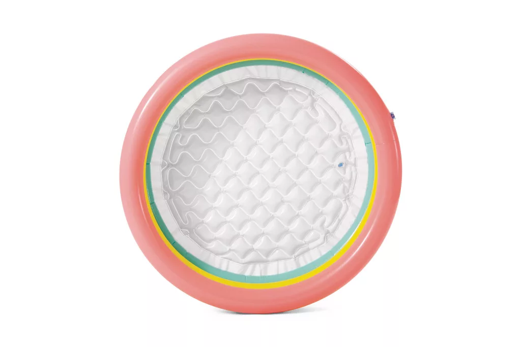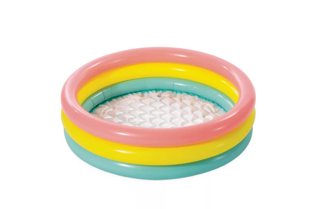Sunset Glow felfújható babamedence 1–3 éves gyermekek számára, puha felfújható padlóval. Az oldalfal három különböző színű gyűrűből áll.