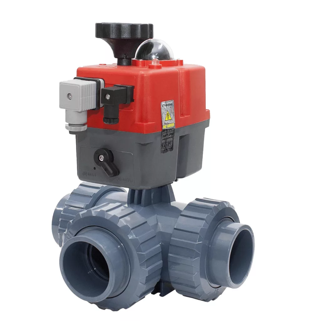 Kiváló minőségű PVC-U 3 utas motoros golyóscsap. A 3 utas golyóscsapok nagyobb rugalmasságot és sokoldalúságot biztosítanak az áramlási útvonalak kezelésében. A motoros golyóscsap egy elektromos motorral felszerelt változata a hagyományos golyóscsapnak. A motoros változatnál a gömb forgatása nem kézzel, hanem elektromos motor által történik. Automatizált működésének köszönhetően egyszerűbben és biztonságosabban használható a golyóscsap. Hosszú élettartam, kiemelkedő korrózióállóság és kopásállóság jellemzi. Felhasználhatósága egyszerű, összeszerelése praktikus és gyors.